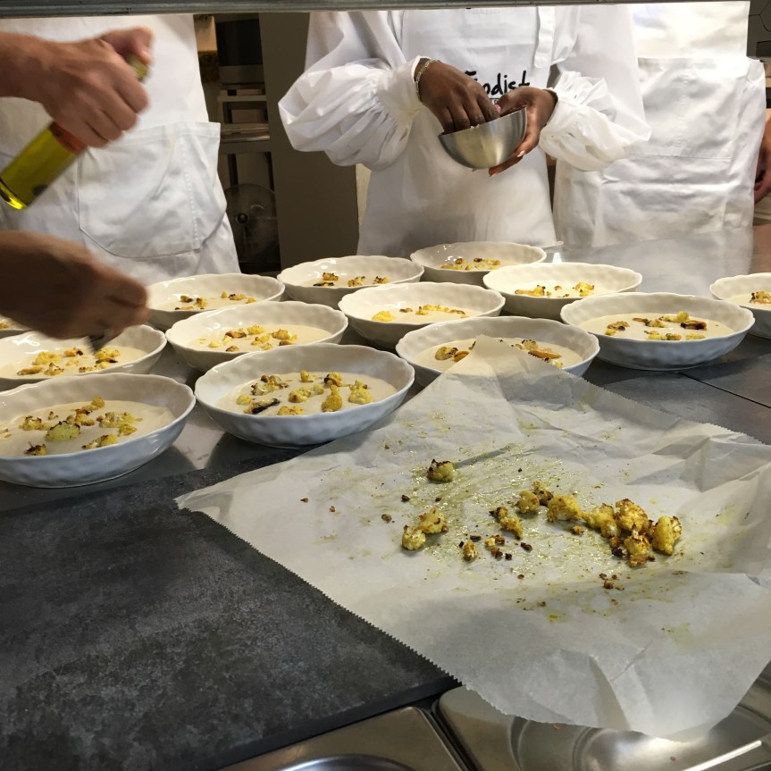 Our menu consisted of cauliflower soup, coq au vin, and peach Melba (which as an Australian I found hilarious). Our class of twelve was divided into different working groups at different times to do a range of prep. While doing so we tried different French white wine and two different Bries. We ate everything that we prepared.